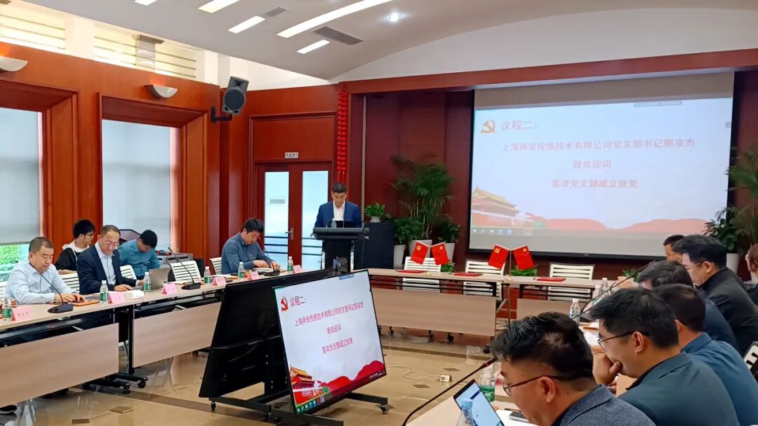在深创投党员代表与拜安科技全体党员共同见证下,上海拜安传感技术有限公司党支部书记郭凉杰先生致欢迎词并宣读党支部成立批复,上海拜安传感技术有限公司党支部正式成立揭牌,开启了公司党建工作新的篇章。