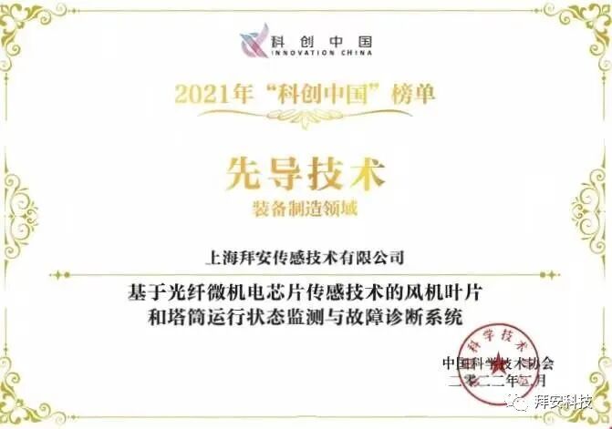长期以来,拜安科技特别注重知识产权保护。截止目前,拜安科技各类知识产权近百余项,其中发明专利“一种光纤光栅拉力传感器”于2022年获得浦东新区科技发展基金高价值专利产业化实施专项资助。作为一家国家级“专精特新”小巨人企业,拜安科技始终注重产研结合,突破了MEMS光纤传感器的异质巨集成工艺,实现光谱干涉仪的芯片化制造,使压力、流量、应变等多种传感器的精度优于万分之一;并推动MEMS传感器从电子式、光电式到无源光谱式的跨代发展,已在轨道交通、风力发电等领域实现了国际开创性应用。核心技术之一“基于光纤微机电芯片传感技术的风机叶片和塔筒运行状态监测与故障诊断系统“入选2021“科创中国”先导技术榜(装备制造领域)。