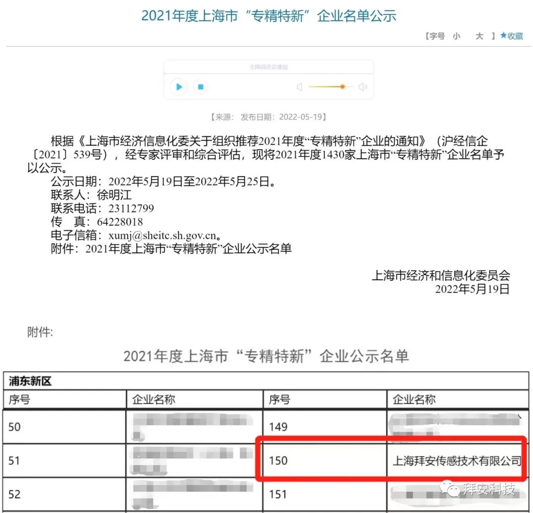 近日,上海市经济和信息化委员会根据《上海市经济信息化委关于组织推荐2021年度“专精特新”企业的通知》(沪经信企〔2021〕539号),经专家评审和综合评估,公示了2021年度1430家上海市“专精特新”企业名单,“上海拜安传感技术有限公司”凭借独特技术优势成功获评!