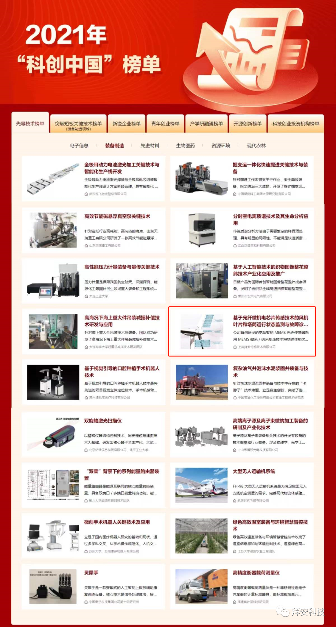 上海拜安传感技术有限公司凭借“基于光纤微机电芯片传感技术的风机叶片和塔筒运行状态监测与故障诊断系统”突围入选2021“科创中国”先导技术榜(装备制造领域)榜单。