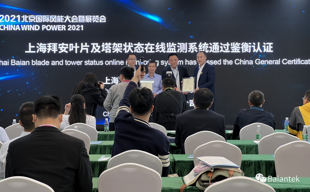 2021年10月18日12:10-12:30上海拜安传感技术有限公司与北京鉴衡认证中心有限公司在中国国际展览中心举行了《上海拜安叶片及塔架在线监测通过鉴衡认证》发布会,获得了由北京鉴衡认证中心颁发的认证证书。