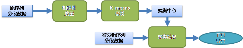 基于聚类的异常检测模型:将原数据分为很多等长的序列段,使用相似性度量效果比较好的动态时间规整(DTW)算法计算了不同序列段的距离。在使用k-means对序列段的聚类过程中,产生了几个聚类中心,序列和哪个聚类中心的距离短,表示序列属于哪个类。在连续的时间段内,该时间段的所有分段数据被聚为同类,如果某段和前后段的聚类结果不同,则可判定该点为异常。