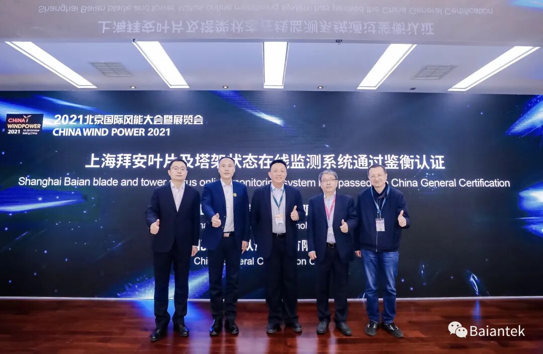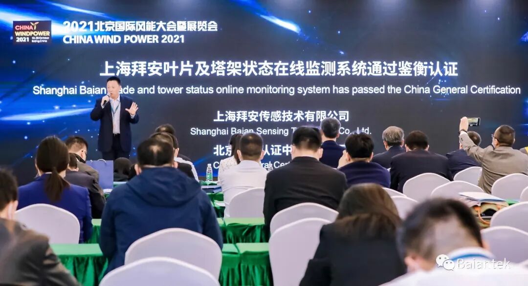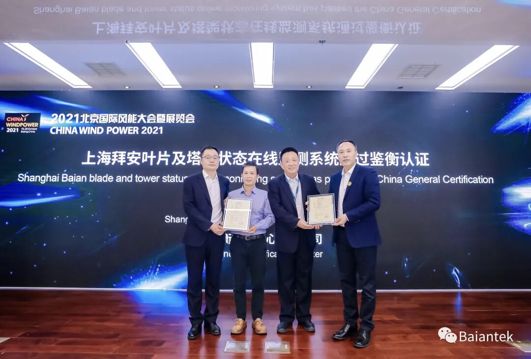 2021年10月18日12:10-12:30上海拜安传感技术有限公司与北京鉴衡认证中心有限公司在中国国际展览中心举行了《上海拜安叶片及塔架在线监测通过鉴衡认证》发布会,获得了由北京鉴衡认证中心颁发的认证证书。