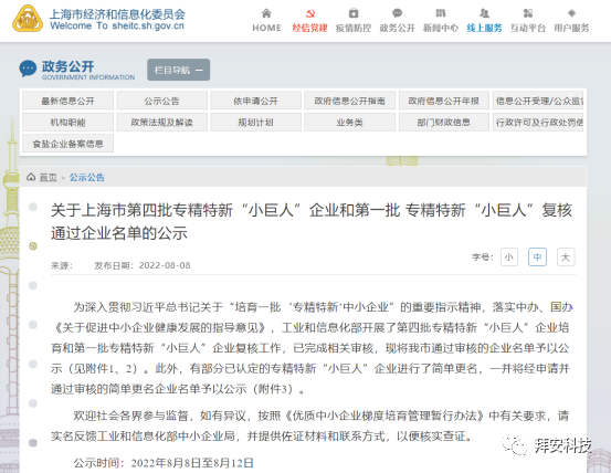 近日,工业和信息化部开展了第四批专精特新“小巨人”企业培育和第一批专精特新“小巨人”企业复核工作,上海拜安传感技术有限公司(以下简称拜安科技)成功入围,并在上海市第四批专精特新“小巨人”企业名单中予以公示。(信息来源:http://www.sheitc.sh.gov.cn/gg/20220808/bb37dba3b038439d89d1f67e775752ce.html)专精特新“小巨人”是由工信部组织开展选出的在专业化、精细化、特色化、新颖化四方面均表现突出的企业,旨在培养促进企业做精做大做强,聚焦制造业短板弱项,提升产业基础及高级产业链现代化水平,为推动经济高质量发展、构建新发展格局提供有力支撑,是我国实现制造强国的生力军。上海拜安集设计、研发、生产、数据服务于一身,以“推动清洁能源和绿色交通运输数字化、智能化发展”为企业愿景,努力成为工业互联网传感器的领导者,本次入选榜单是其企业综合实力的具体表现。关于上海拜安上海拜安传感技术有限公司(简称拜安科技)是2004年成立于上海张江自由贸易试验区的高新技术企业,拥有200余人的专业团队。公司专业从事高性能MEMS光纤传感器和全光谱传感分析仪智能硬件的研发和制造,为清洁能源、绿色交通和生物医学提供更加精确的测量手段和数据运维。公司在上海、北京、成都、无锡、长沙和太原设立有公司,涵盖MEMS芯片设计和工艺流片、光学芯片封装、传感器和宽光谱波长可调谐激光器制造、专用集成电路和嵌入式软硬件设计、光谱图像智能识别、行业大数据平台开发、光机电设备微小型化集成等完整的专业技术能力,可为MEMS、光电子和生物医学等各类优秀人才提供优厚待遇和广阔事业发展平台。公司已获得多家知名机构及产业资本数亿元投资,在上海市嘉定综合保税区成立了上海拜安半导体有限公司,建设有5400m2洁净室和6寸MEMS工艺平台,具备氧化扩散、光刻键合、薄膜沉积、干法刻蚀和湿法腐蚀等完整的MEMS芯片生产能力和划片、自动化封装及测试等封测能力,预计将于2022年年底投产。拜安科技将发挥自身的技术优势、人才优势,竭诚与各企业、高校及科研院所合作,帮助客户完成MEMS产品开发、MEMS产品生产及各类以微纳制造为基础的产品的共同研发。拜安科技虔诚欢迎社会各界携带优质项目前来洽谈合作,我们将提供从技术支持、资金支持到市场推广等全方位的服务。 END